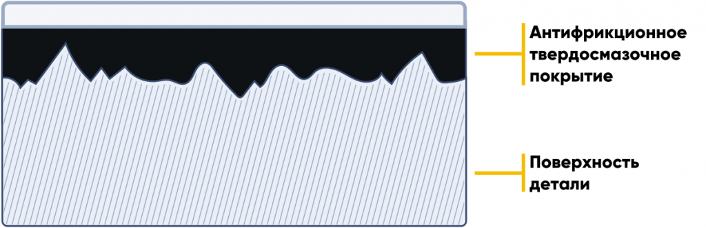 После нанесения растворители испаряются, а связующее вещество полимеризуется, прочно сцепляясь с основой. В зависимости от типа связующего отверждение происходит при обычной температуре или при нагреве. После полимеризации покрытие представляет собой матрицу с распределенным в среде связующего вещества частицами твердых смазок (рис. 2).