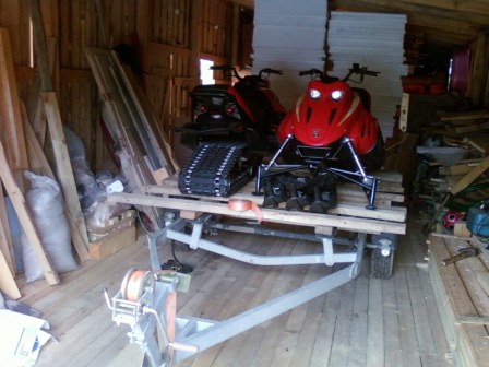 Благодаря трем регулируемым амортизаторам от мотоцикла “Иж”, задняя подвеска высоко поднята, поэтому в гусеничном тоннеле не скапливается грязь и снег во время поездок по рыхлому снегу. Кроме того, амортизаторы позволяют подвеске выдерживать вес двух седоков. Заднее крыло и гусеничный тоннель сделаны из качественного и прочного полиэтилена, который прекрасно работает при низких температурах. Гусеницы такие же, как на снегоходе “Буран”, оснащены специальными стальными скобами.
