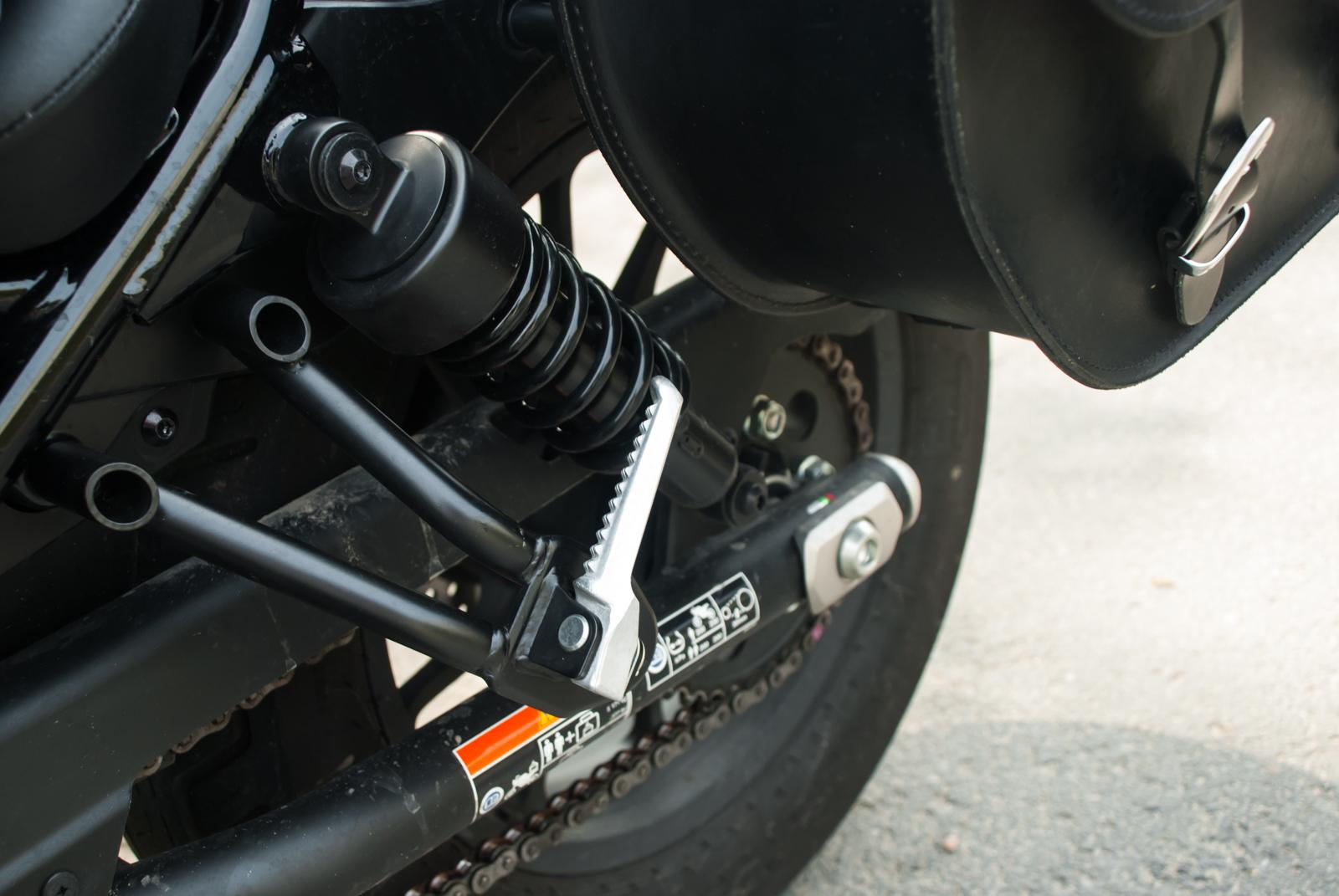 Привод заднего колеса на Rebel 250 цепной — самое логичное решение для малой кубатуры, чтобы избежать потерь и без того небольшой мощности при передаче крутящего момента. Тормоза — самые классические, один диск спереди и барабан сзади. Для лёгкой и маленькой «Хонды Ребел» этого вполне достаточно, и при эффективной работе обоими тормозами мотоцикл останавливается, как вкопанный.