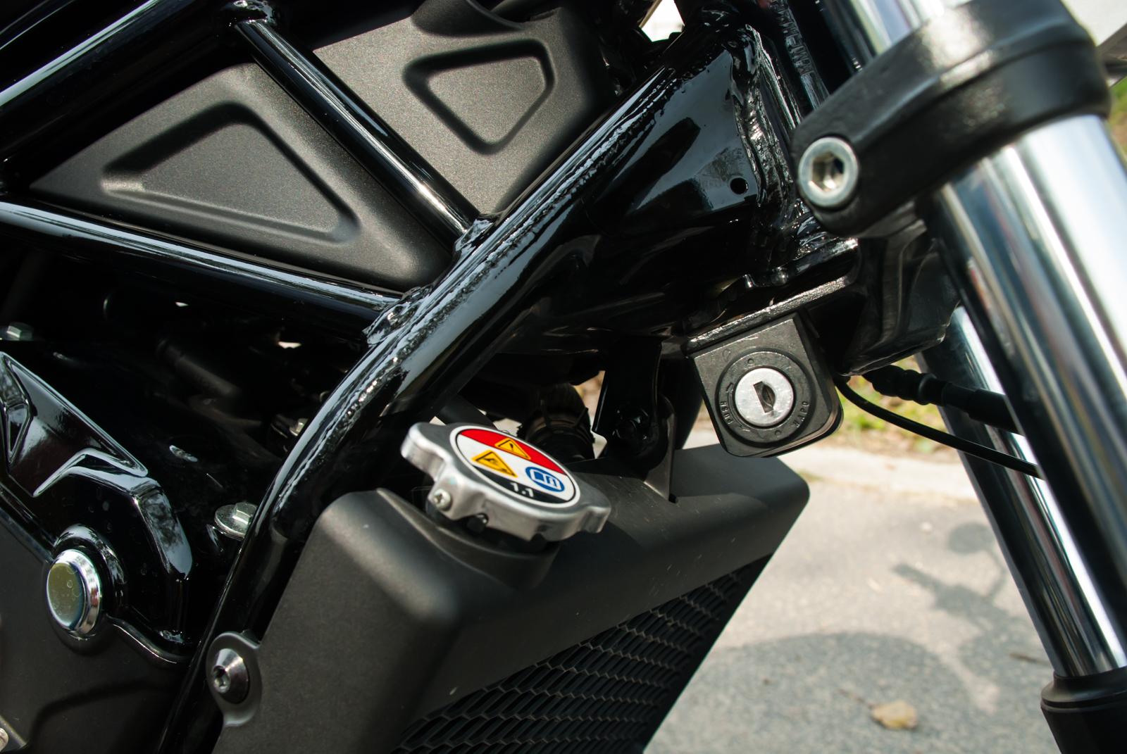 На рулевом колесе довольно скромные часы, в сочетании с розеткой 12 В. Однако использовать ее может быть сложно, поскольку не очень сложно установить устройство, которое мы хотели бы зарядить. Эргономика также не является сильной стороной выключателя зажигания. Этот для стрельбы (потому что их два!) Можно найти под топливным баком, на левой стороне мотоцикла. Однако если вы хотите заблокировать рулевое колесо после парковки, вы должны переместить ключ вправо и найти ключ зажигания номер два рядом с головкой рамы. Трудно найти логическое объяснение этой «перестановке». Но, видимо, кто-то решил, что переход в обычном месте устарел, и вам нужно придумать что-то, чего еще не было. Однако, как видите, враг добра лучше.