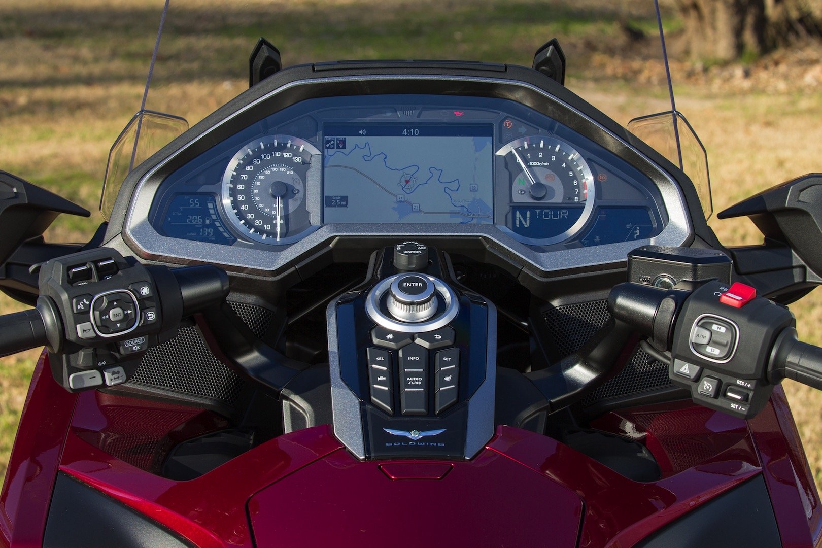 Gold Wing также имеет бортовой компьютер с GPS, что позволяет вам управлять дополнительными системами на мотоцикле и очень приятной аудиосистемой. Однако у GPS довольно плохие параметры, и экран сходит с ума из-за датчика освещенности. Ночью он может перейти в дневной режим только потому, что на детектор падает падающий световой луч автомобиля сзади.