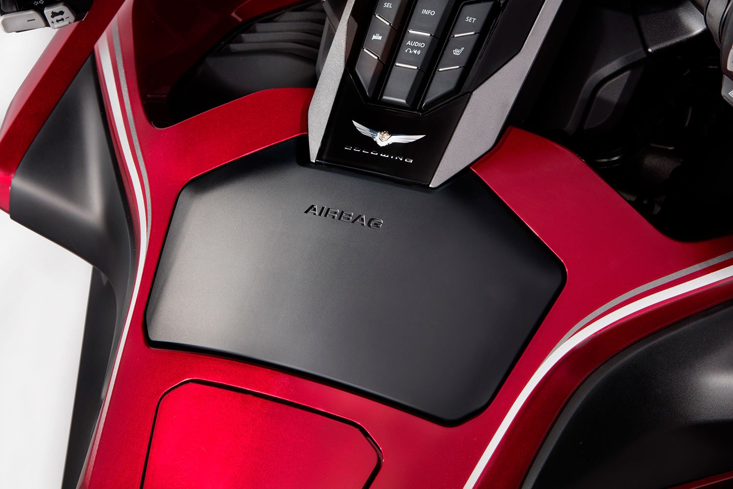 Впрочем, в качестве опции можно заказать «гриль» на верхний кофр, куда получится привязать дополнительную поклажу, а совсем мелкие предметы вроде ключей складываются в запираемый бардачок у правого колена пилота. Базовая комплектация имеет еще один вещевой бокс, расположенный в накладке бака, но в нашем исполнении на его месте находилась опциональная подушка безопасности. Она появилась еще на прежней генерации и перекочевала на новейшую. Кстати, Honda Gold Wing остается единственным мотоциклом в мире с такой системой.
