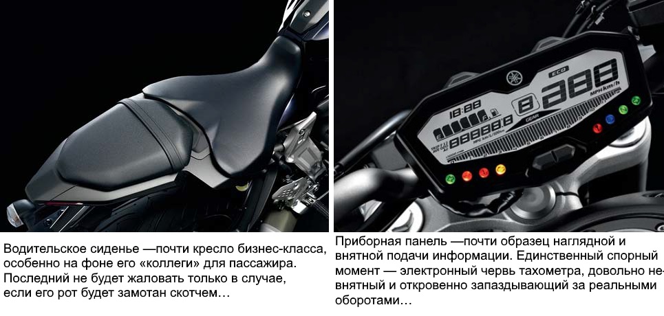 Что до удобства и комфорта, то о них говорить, конечно, особо не приходится. Конечно, Yamaha MT-07 может обоснованно похвастаться удобной посадкой и продуманным расположением приборной панели и всех органов управления, но с ними соседствует приятное на ощупь, но жёсткое седло, причём пассажирская «нашлёпка» вообще вызывает опасения за пятую точку того, кто будет на ней сидеть дольше часа. Ну что ж, в конце концов, это чисто городской байк, начисто лишённый защиты от ветра и не претендующий на звание туриста, зато привлекательный, современный, мощный и к тому же великолепно управляющийся.