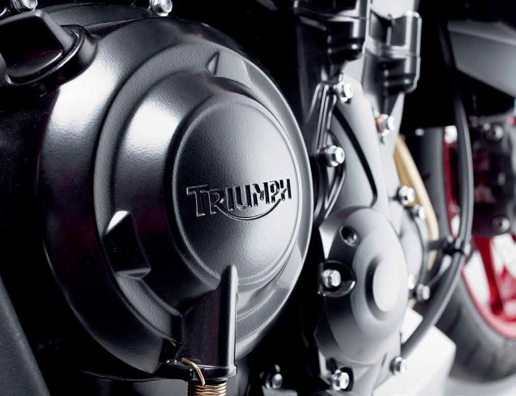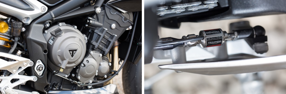 3-цилиндровый 12-клапанный рядный мотор выдаёт 106 л.с. и 68 Нм крутящего момента, и этого достаточно, чтобы “уйти в точку” резким открытием газа. Несмотря на нестандартную компоновку, инженерам Triumph удалось удачно разместить мотор в раме, наклонив его вперёд и добившись снижения центра масс.