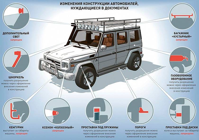 Та же новая аудиосистема не может считаться правонарушением, и не входит в перечень запрещённых процедур по переоборудованию автомобиля. Но если установить слепящий встречные машины ксенон, использовать глухую тонировку на лобовом стекле или форсировать двигатель, не изменив при этом характеристики в официальной документации, ждите штрафов и возможности конфискации ТС до полного устранения неисправностей.