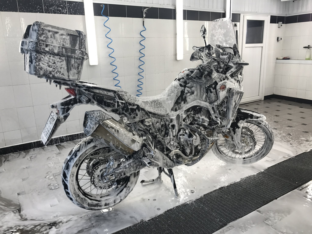 О мойке двигателя внутри мы расскажем вам в статье о замене масла. А вот информация о том, как привести его в приличное состояние снаружи, никогда не потеряет актуальности. Для начала – необходимо выбрать место, где вы будете проводить эту процедуру. Идеальным, конечно, будет гаражный массив, при чем покрытие улочек лучше всего грунтовое – масляные следы на асфальте останутся на много месяцев, за что вы можете получить нагоняй от коменданта. Если же на вашем массиве асфальт – позаботьтесь о том, чтобы застелить под мотоциклом хотя бы газетами, а лучше – целлофаном.