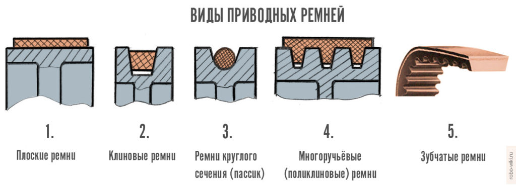 Очень распространенная классификация ремней – по поперечному сечению или форме. Основные виды: 1 — плоские ремни, 2 – клиновые ремни, 3 – ремни круглого сечения (пассики), 4 – многоручьевые ремни (или поликлиновые), 5 – зубчатые ремни.