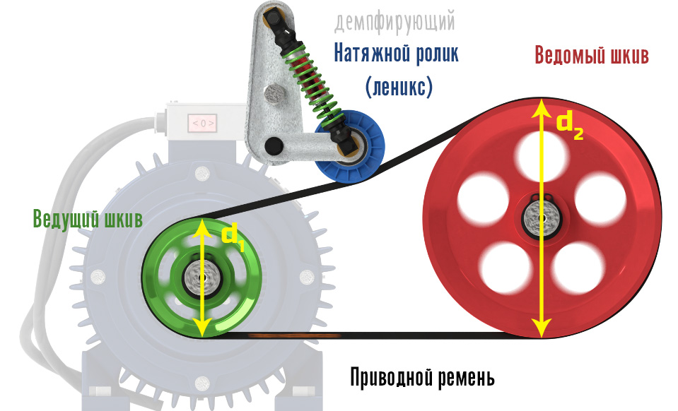 Диаметр ведущего шкива мы обозначим английской буквой d1, а ведомого — буквой d2. Нам это понадобится при расчетах.
