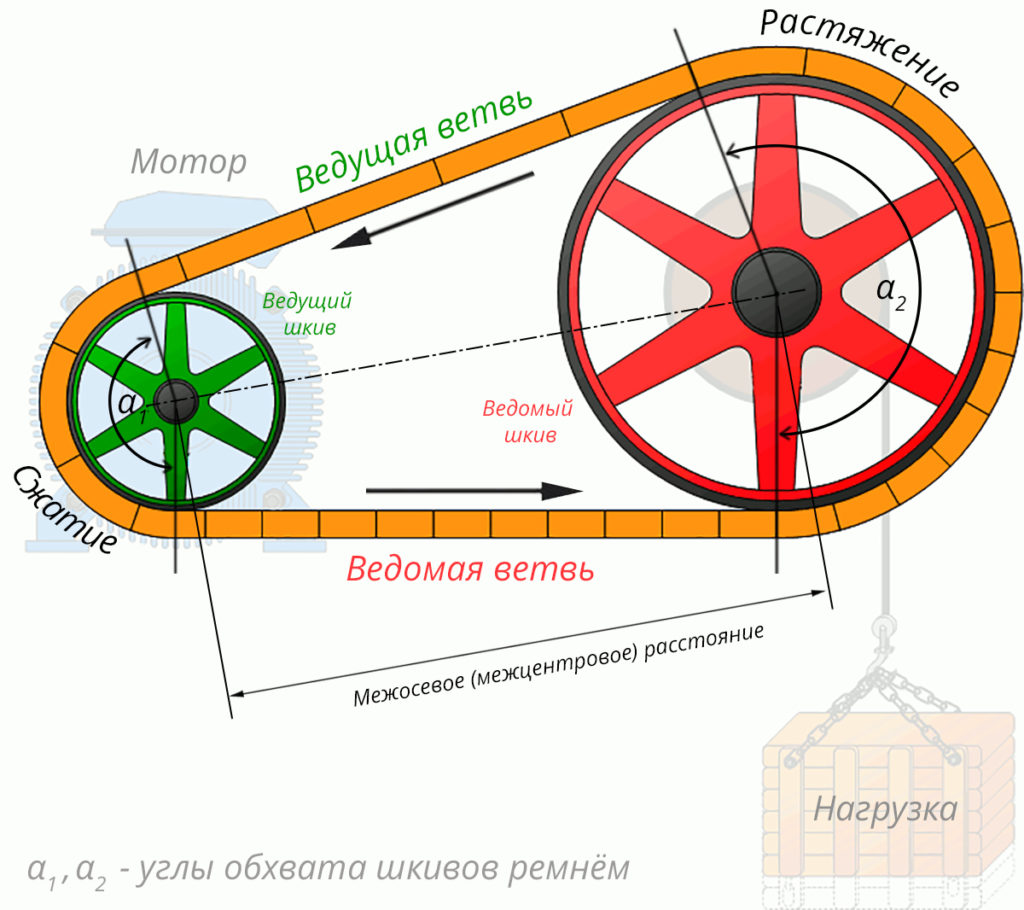 Также важно знать про угол обхвата ремнём шкива. Чем больше угол обхвата, тем больше площадь контакта, тем больше полезная сила трения